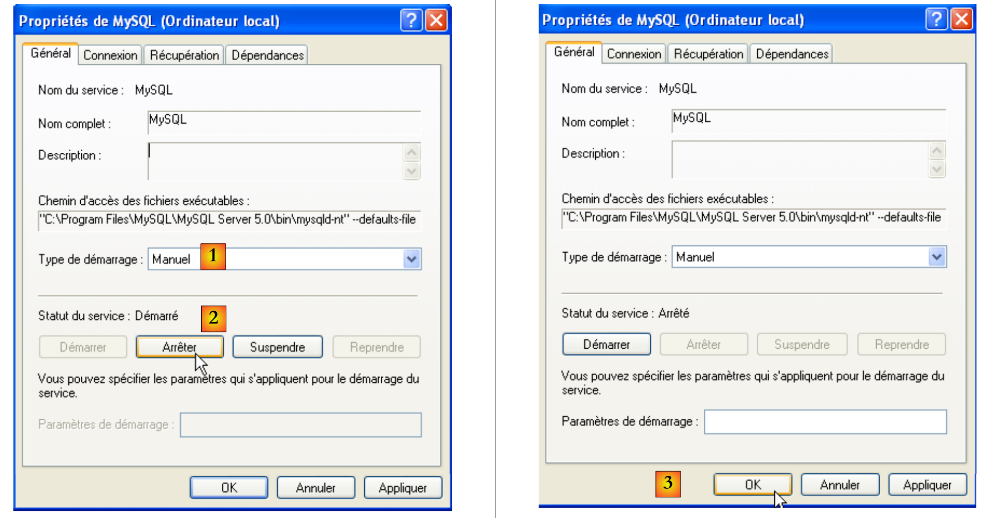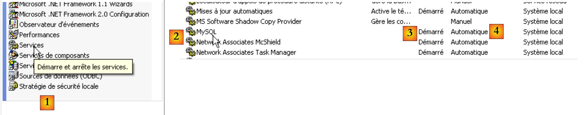 - in [2]: we see that a service named [MySQL] is present, that it is running [3], and that it starts automatically [4].