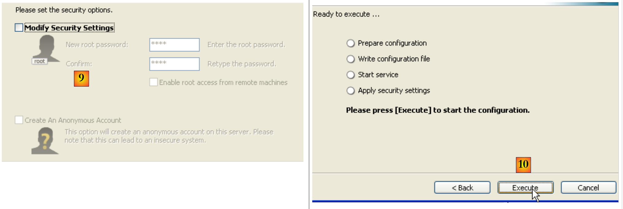 - in [9]: By default, the server administrator is root with no password. You can keep this configuration or set a new password for root. If the MySQL5 installation follows the uninstallation of a previous version, this step may fail. There is no way to undo it.