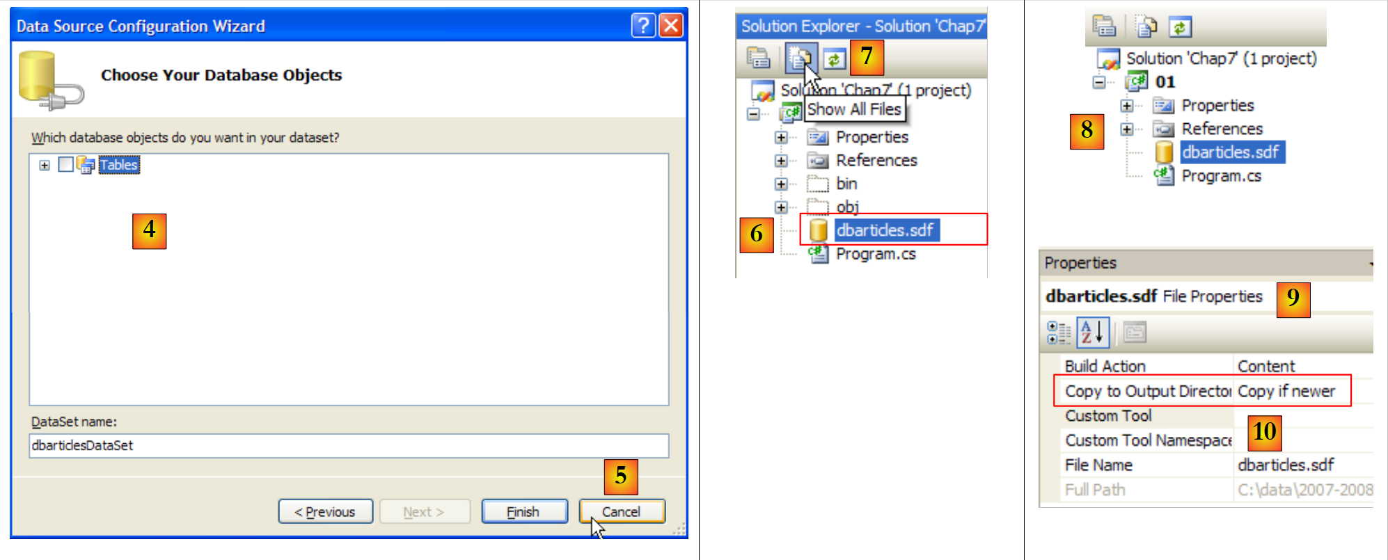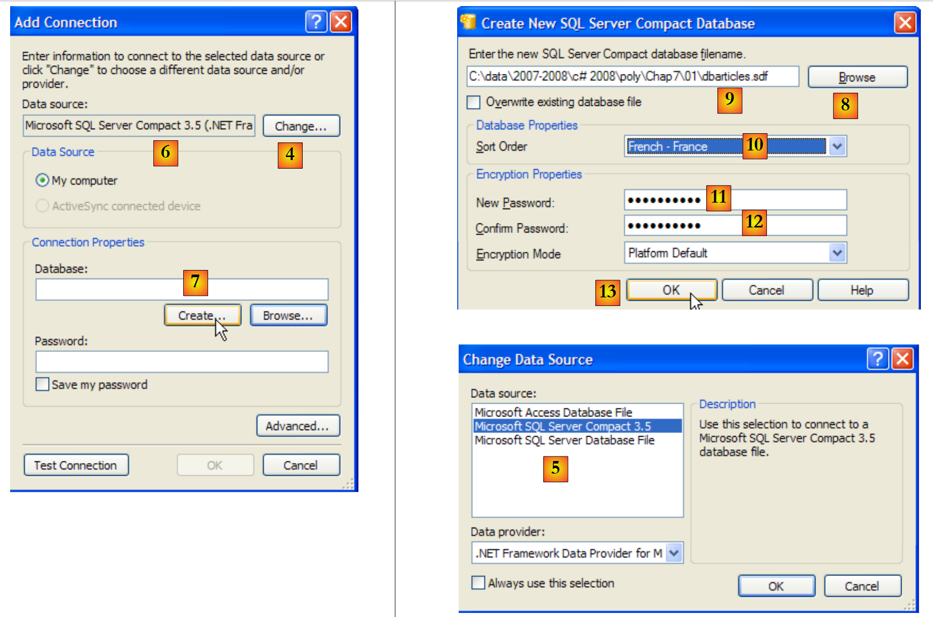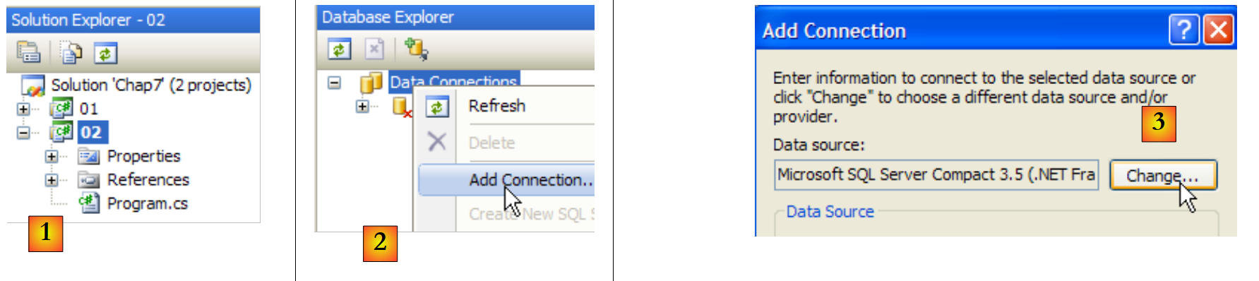 - [8]: A SQL Server Compact database is encapsulated in a single file with the .sdf extension. Specify where to create it; here, in the C# project folder.