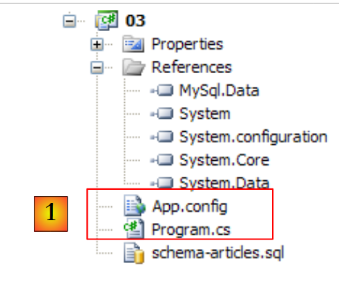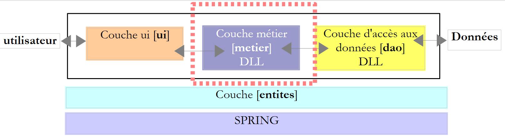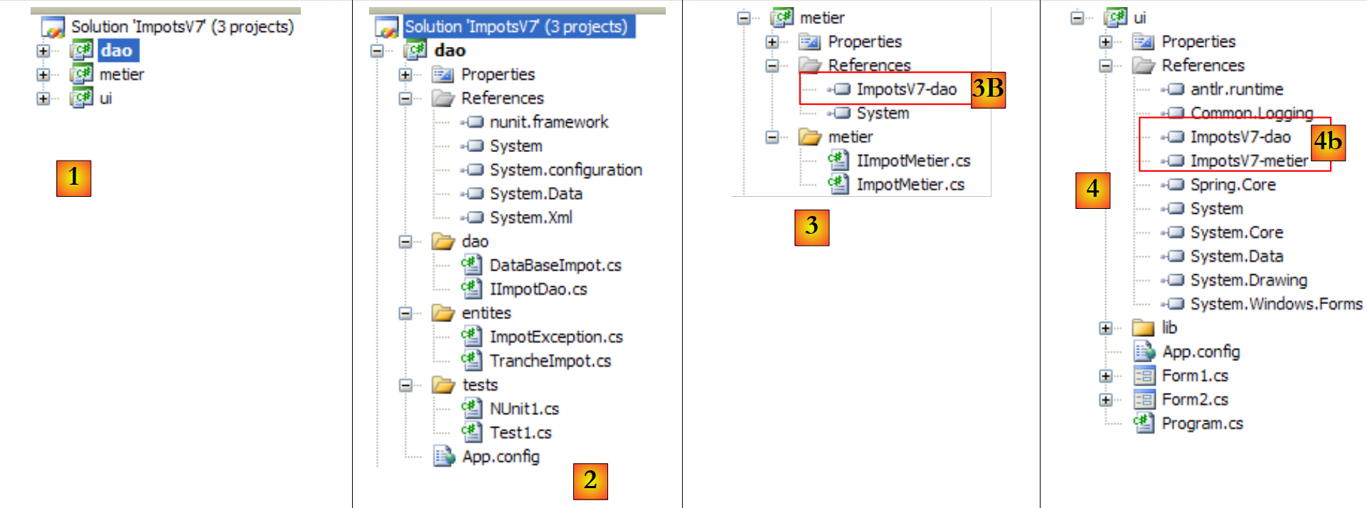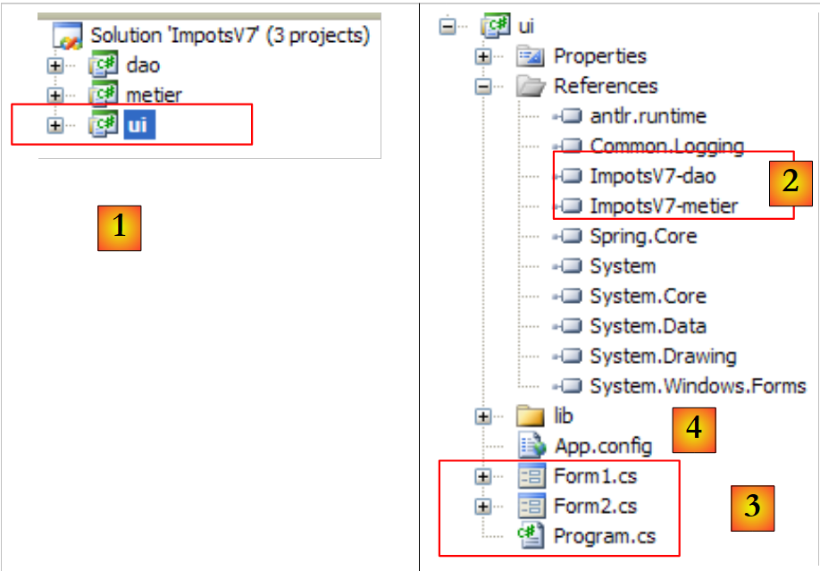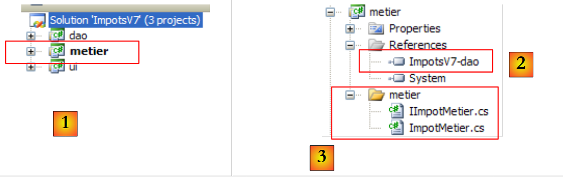- in [2]: the project references. Note the references to the DLLs of the [dao] and [metier] layers.