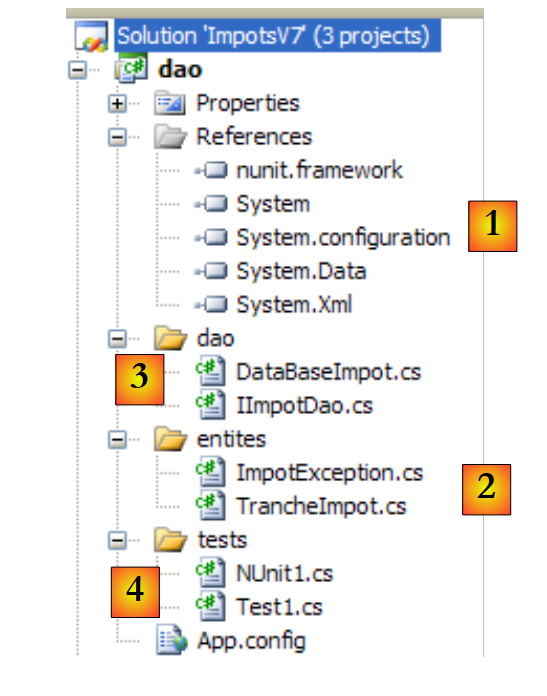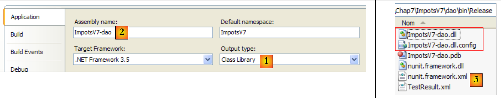 - in [3]: after generating (F6) the project, the [dao/bin/Release] folder contains the DLL [ImpotsV7-dao.dll]. It also contains the configuration file [App.config] renamed to [DLL name].config. This is standard in Visual Studio.