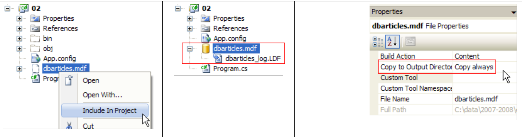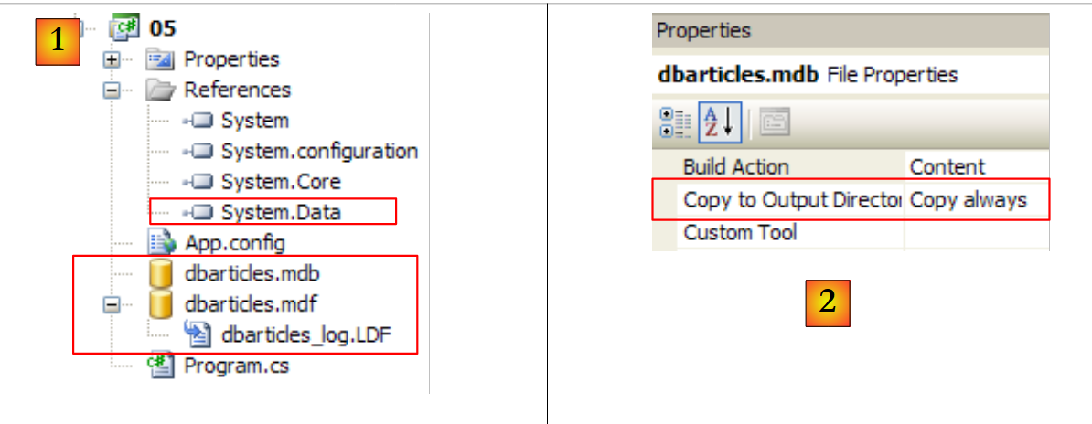 - [9]: In the database properties, we can see [10] that it will be automatically copied to the project’s runtime folder. This is where the program we’re going to write will retrieve it.