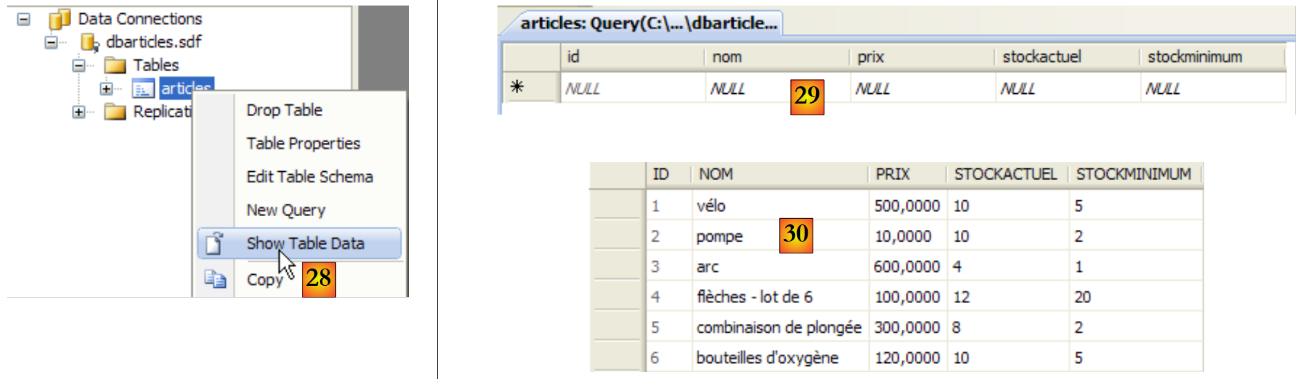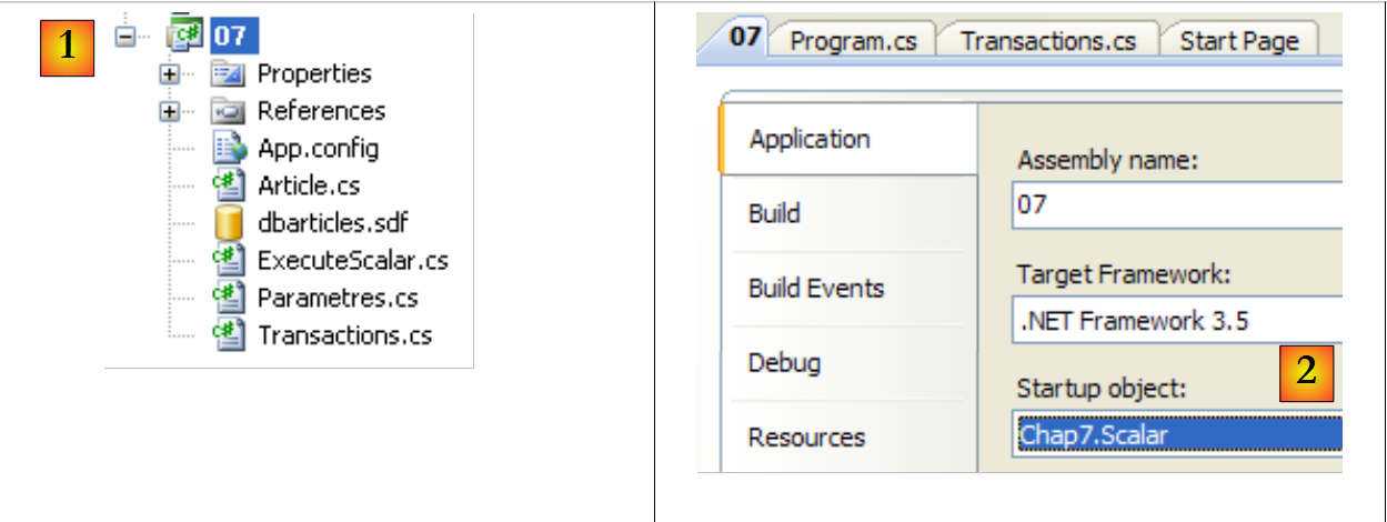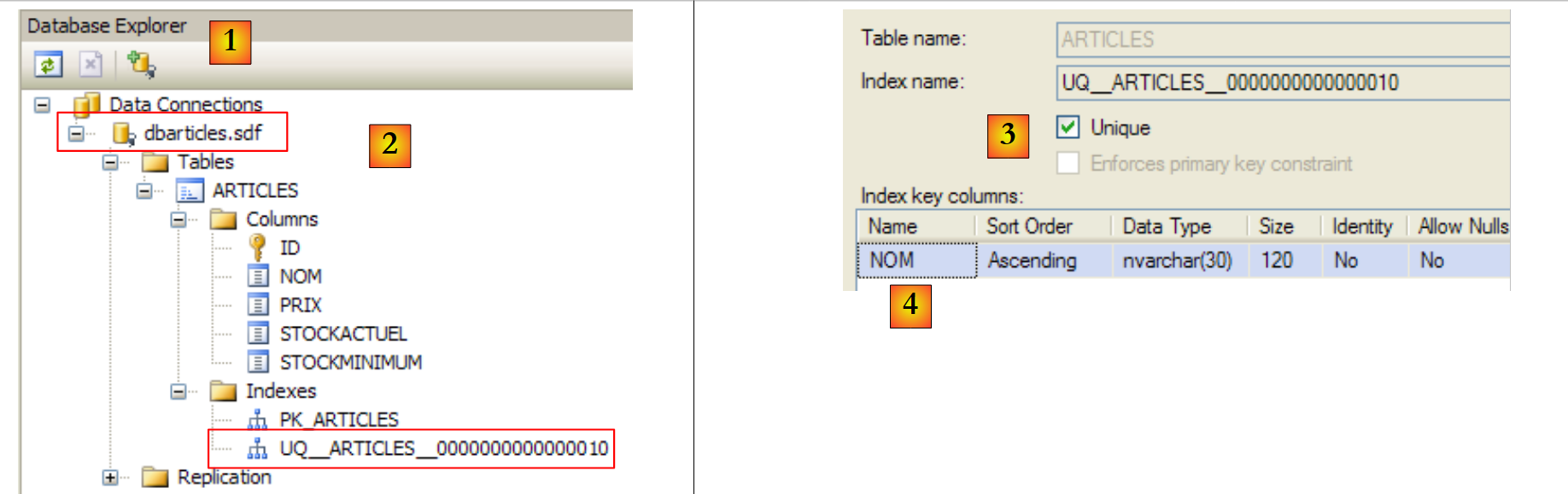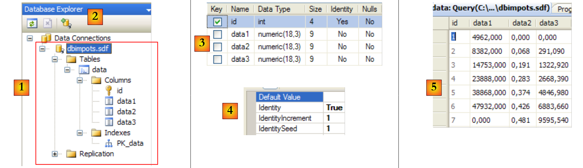- [1]: the [dbimpots.sdf] database in the [DataBase Explorer] view of Visual Studio [2]. It was created without a password.