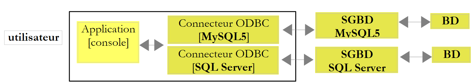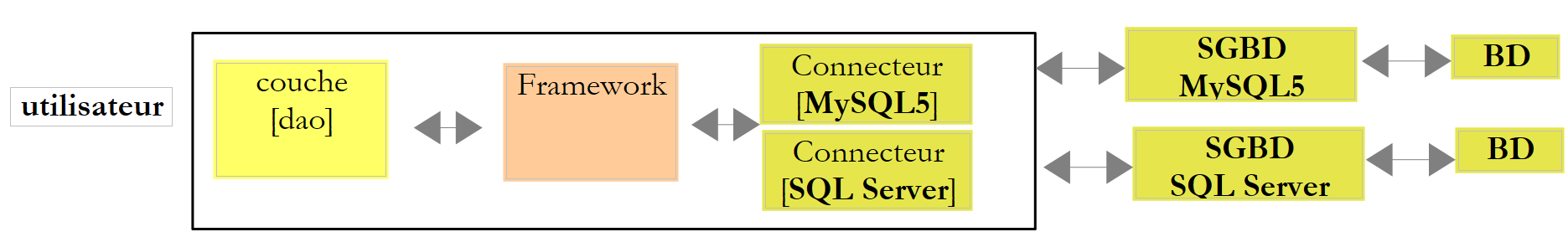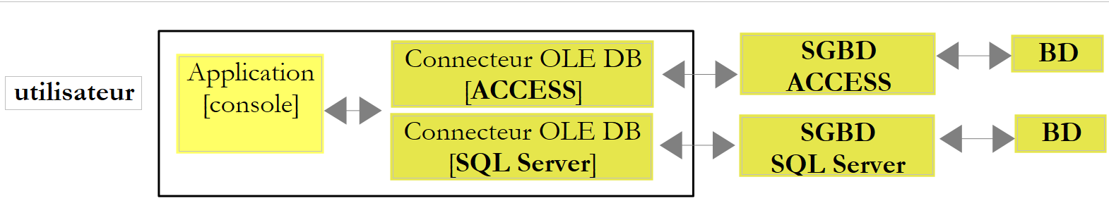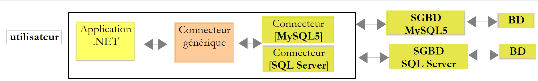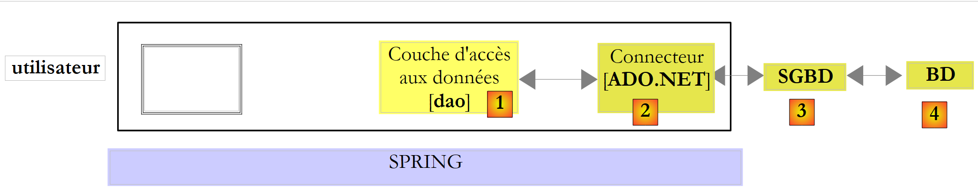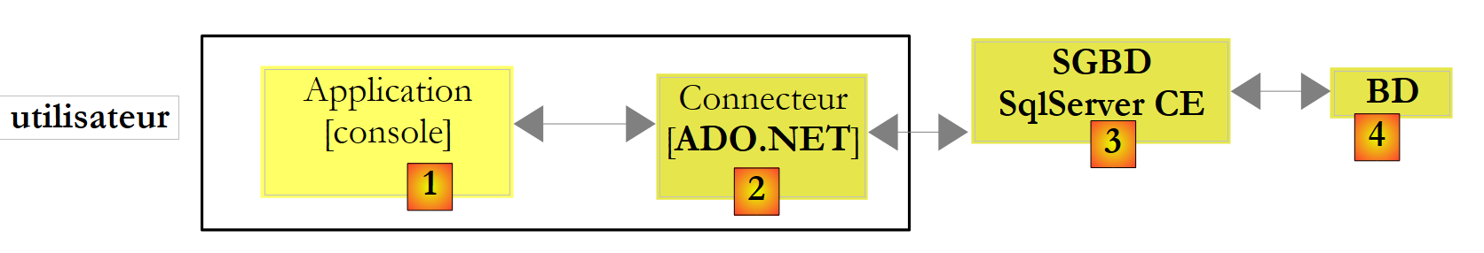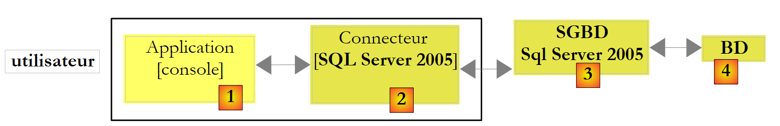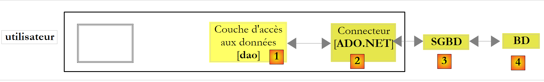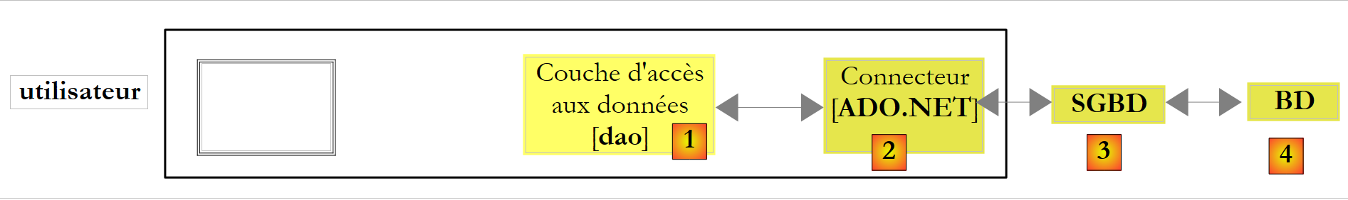In the diagram above, the [DAO] layer [1] communicates with the DBMS [3] through a class library specific to the DBMS in use and provided with it. This layer implements standard features grouped under the term ADO (ActiveX Data Objects). Such a layer is called a provider (in this case, a database access provider) or a connector. Most DBMSs now have an ADO.NET connector, which was not the case in the early days of the .NET platform. .NET connectors do not provide a standard interface to the [DAO] layer, so the latter includes the names of the connector’s classes in its code. If you switch DBMS, you switch connectors and classes, and you must then change the [DAO] layer. This is both a high-performance architecture—because the .NET connector, having been written for a specific DBMS, knows how to make the best use of it—and a rigid one, since changing the DBMS implies changing the [DAO] layer. This second argument should be put into perspective: companies do not change DBMS very often. Furthermore, we will see later that since version 2.0 of .NET, there has been a generic connector that provides flexibility without sacrificing performance.