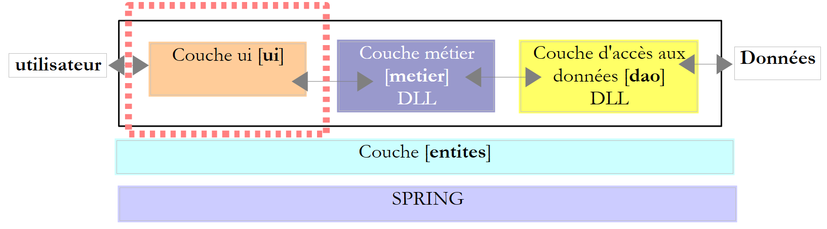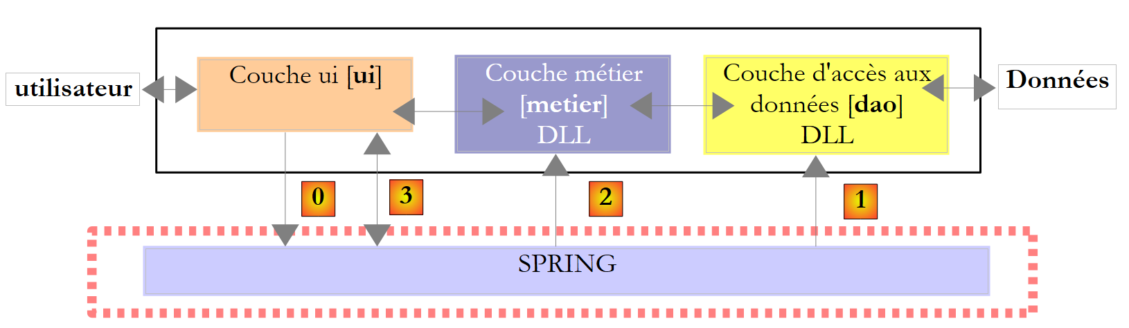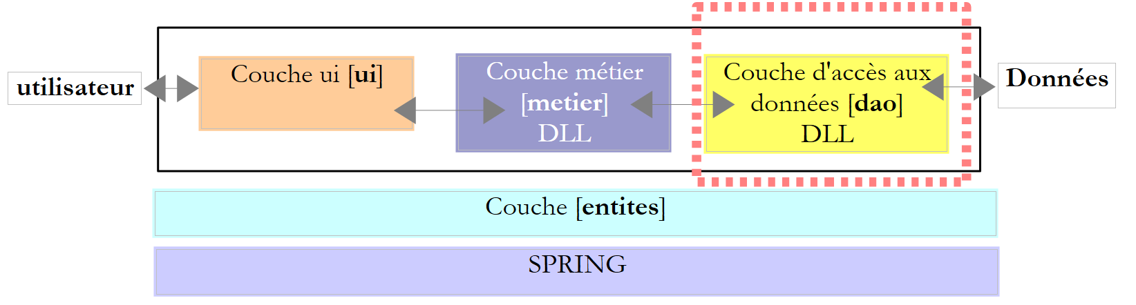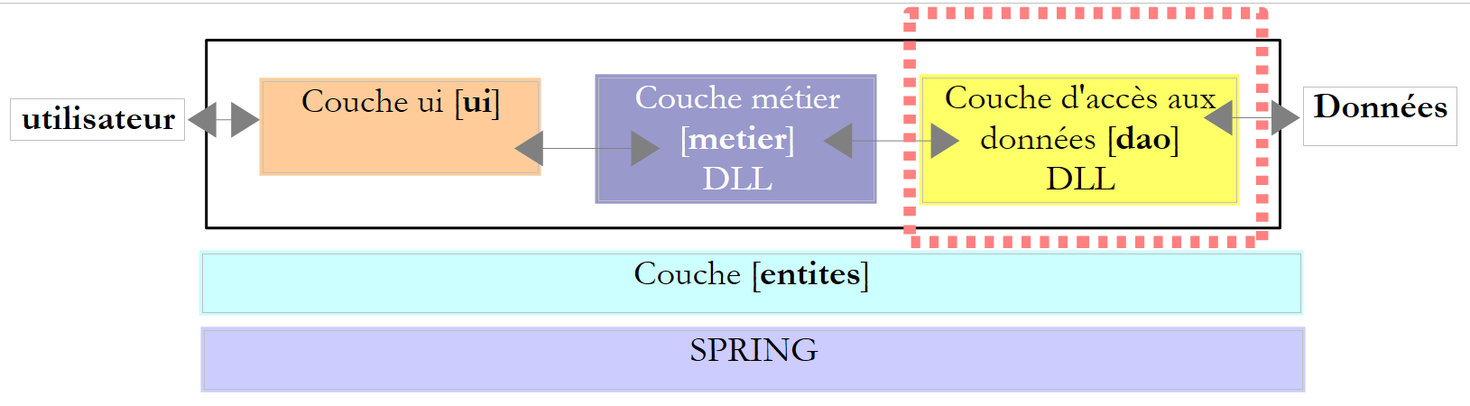 - line 16: the [dao] layer is instantiated by the [Dao.DataBaseImpot] class located in the [ImpotsV7-Dao] DLL