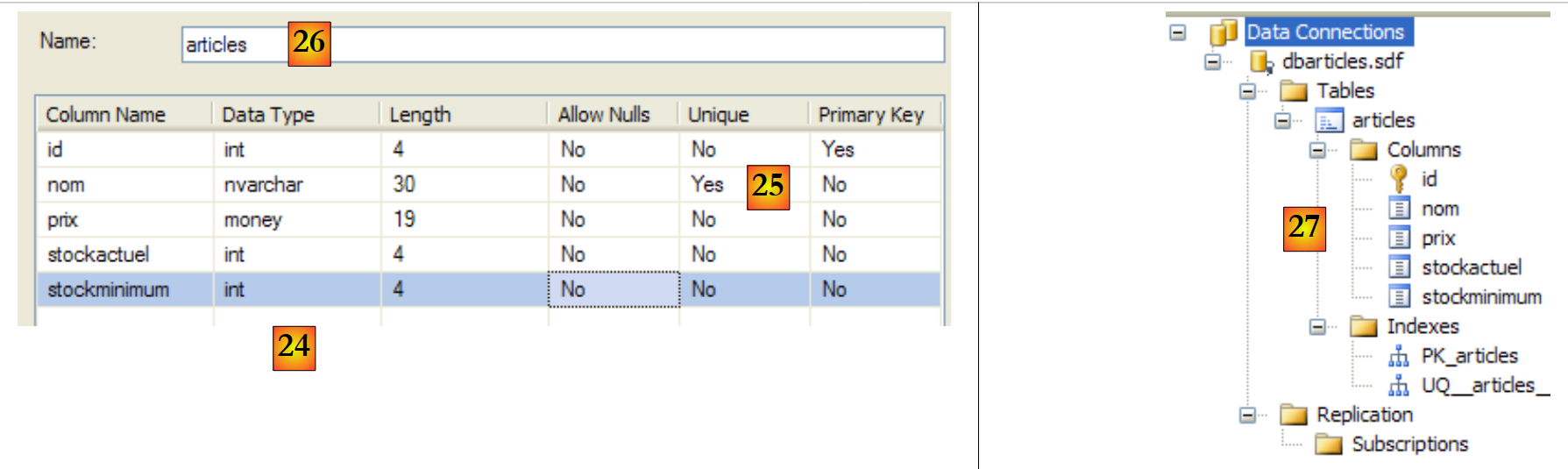 - [23]: This primary key is of the Identity type. This concept, specific to the SQL Server DBMS, indicates that the primary key will be generated by the DBMS itself. Here, the primary key will be an integer starting at 1 and incremented by 1 for each new key.