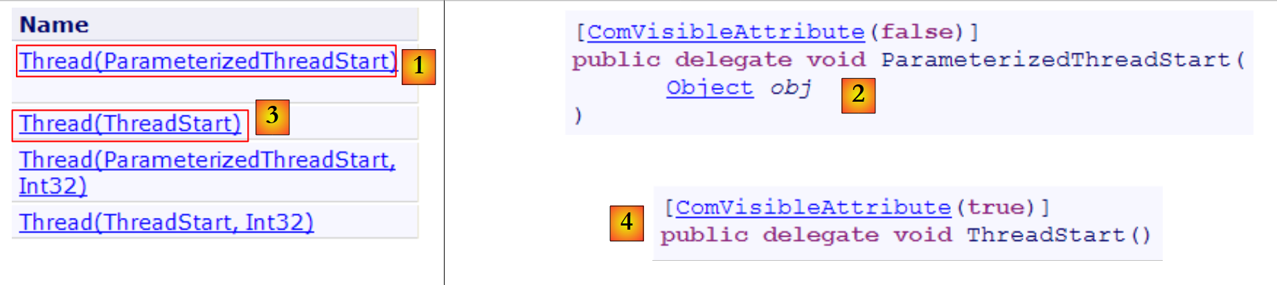 In the following examples, we will use only constructors [1,3]. Constructor [1] takes as a parameter a method with signature [2], i.e., having a parameter of type object and returning no result. Constructor [3] takes as a parameter a method with signature [4], i.e., having no parameters and returning no result.