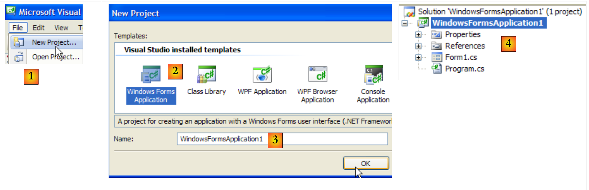 - Line 5: The Form1 class derives from the [System.Windows.Forms.Form] class, which is the base class for all forms. The partial keyword indicates that the class is partial and can be extended by other source files. This is the case here, where the Form1 class is split across two files: