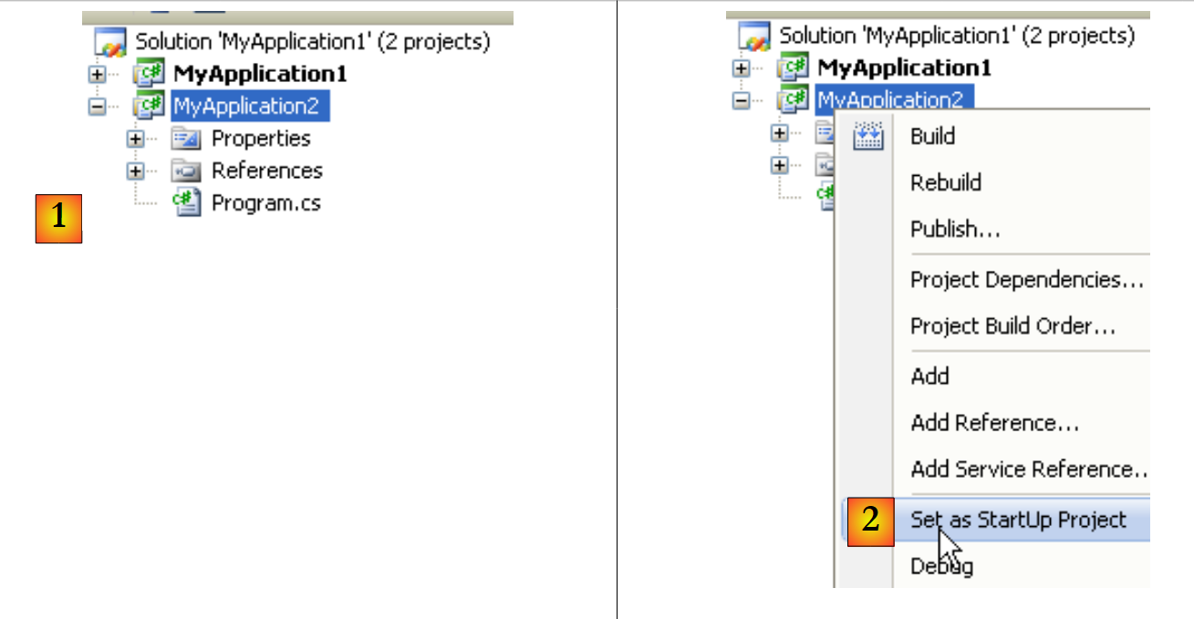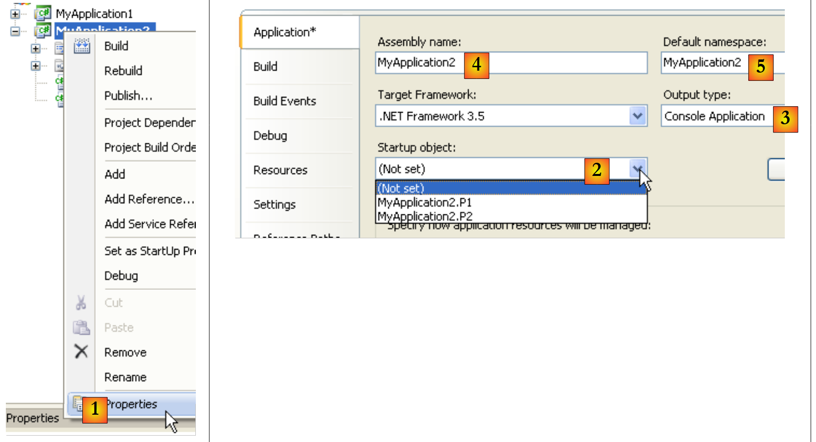 The [MyApplication2] project now has two classes with a static Main method. You must tell the project which one to run: