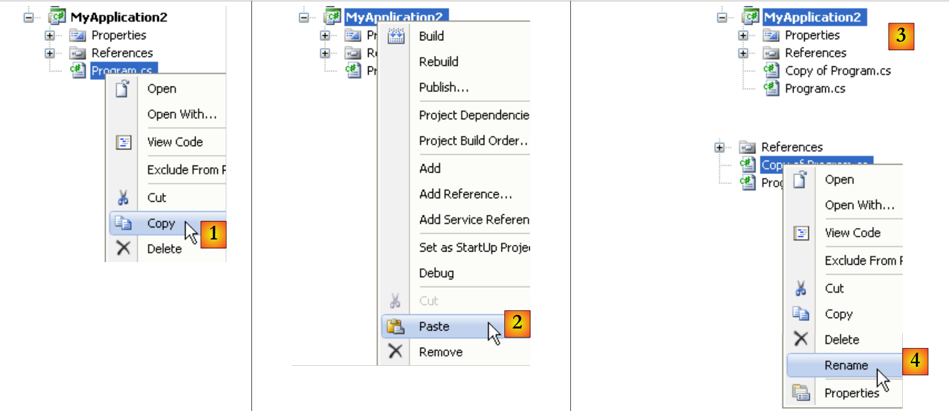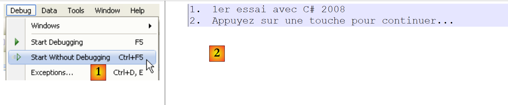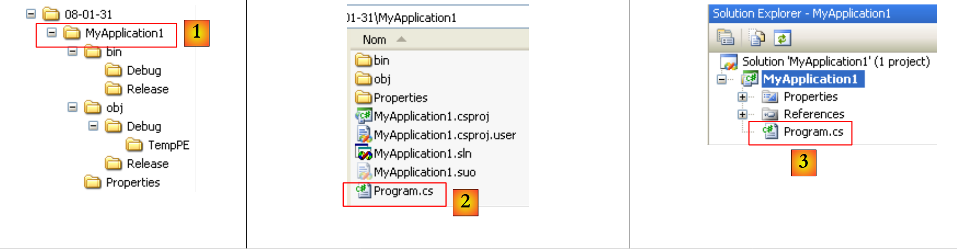 - in [3]: the [Debug] folder, which would also contain a project executable [MyApplication1.exe] if the project had been run in [Debug] mode (F5 key instead of Ctrl-F5). This is not the same executable as the one obtained in [Release] mode. It contains additional information that enables the debugging process to take place.
