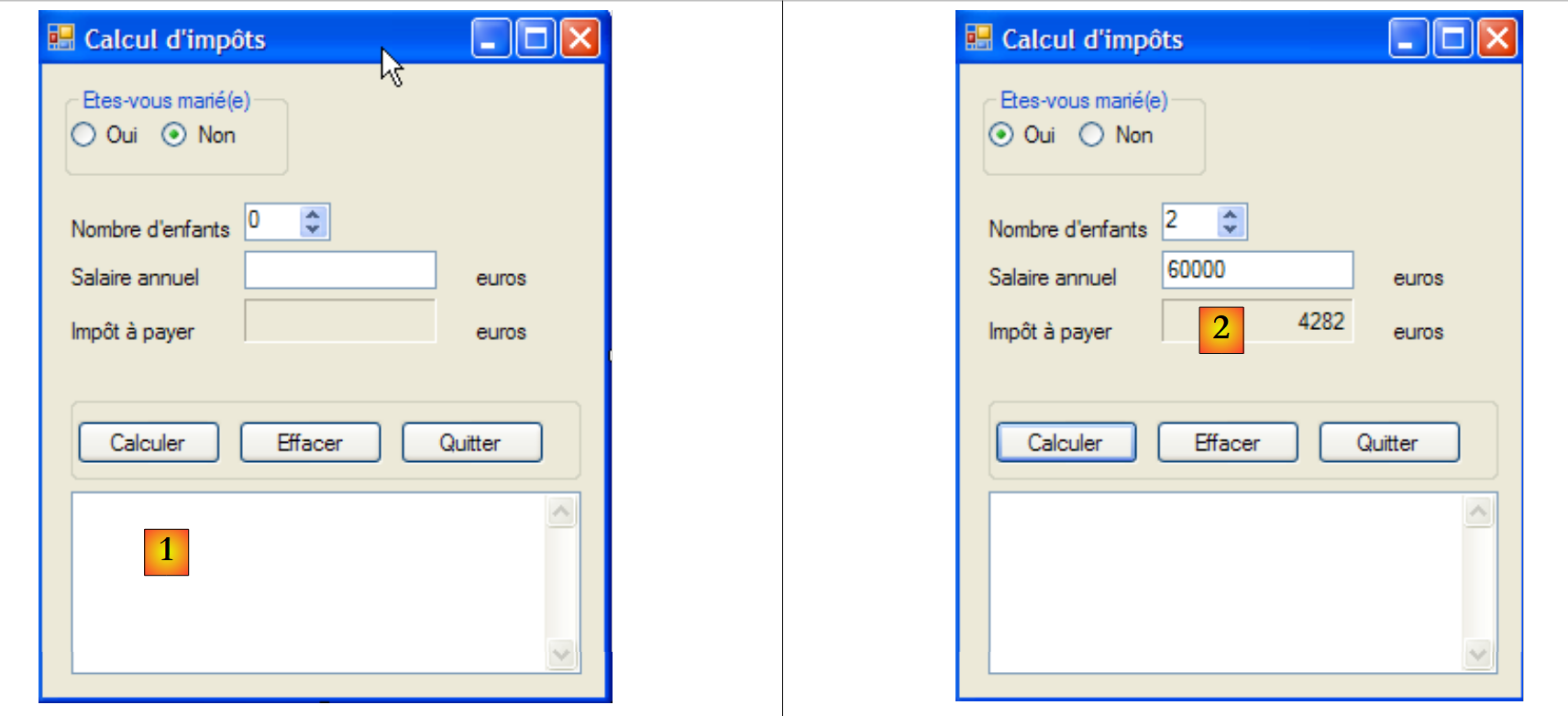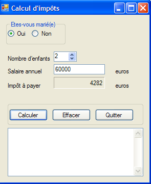 LabelImpot.Text = String.Format("{0} euros", Global.Metier.CalculerImpot(marié, nbEnfants, salaire));