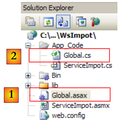 - Line 6: The class is called Global and is part of the WsImpot namespace (line 4). Therefore, its full name is WsImpot.Global, and this is the name that must be entered in the Inherits attribute of Global.asax.