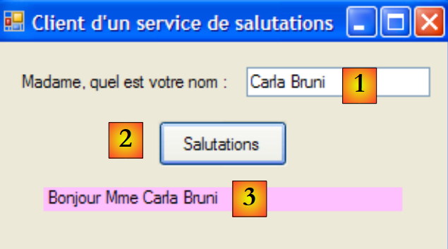 The method accepts a string parameter and returns a string result. The page allows us to execute the [SayHelloToTheLady] method: in [2] we enter the value of the nomDeLaDame parameter, and in [3] we request execution of the method. We obtain the following result: