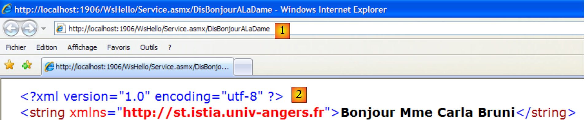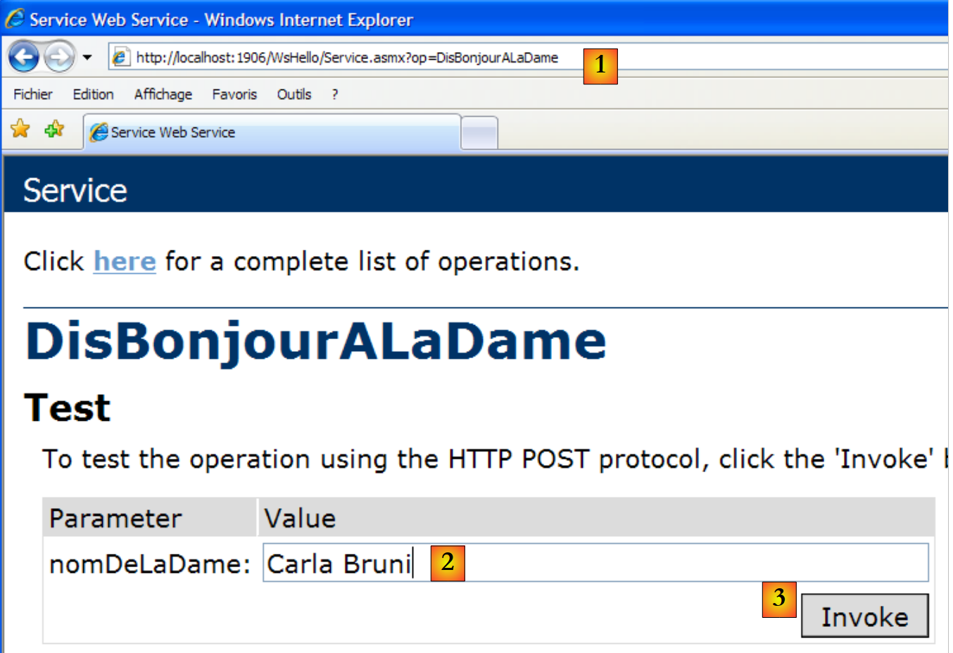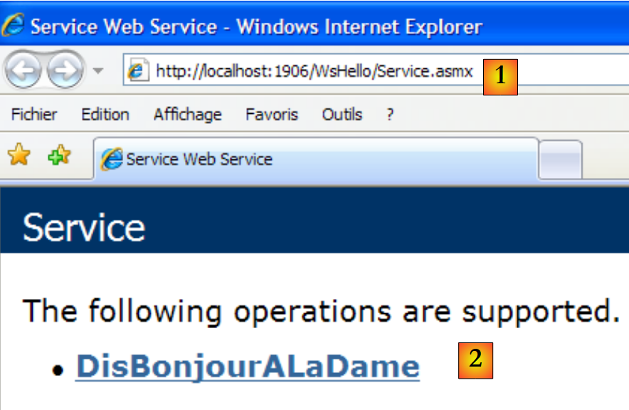 - In [1], note the URI [http://localhost:1906/WsHello/Service.asmx?op=DisBonjourALaDame] of the new page. This is the web service’s URI with the parameter op=M, where M is the name of one of the web service’s methods.