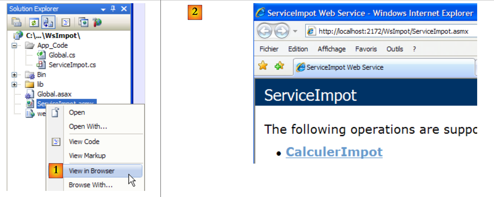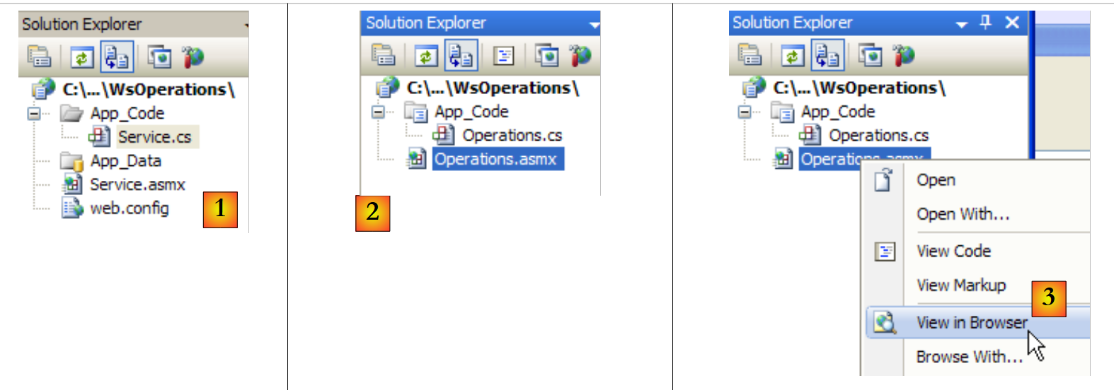 - [1,2]: Right-click on [Service.asmx] and select "Open in browser"