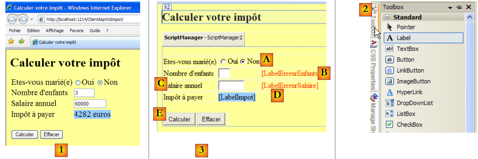 The ButtonCalculer_Click procedure must therefore use the current values of the fields (RadioButtonYes, RadioButtonNo, TextBoxChildren, TextBoxSalary) to set the values of all fields (RadioButtonYes, RadioButtonNo, TextBoxChildren, TextBoxSalary, LabelErrorChildren, LabelErrorSalary, LabelTax) on the new page [Default.aspx] that will be returned to the user.