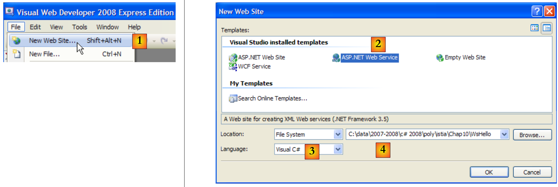 We noted that a web service is hosted by a web server. Writing a web service falls under the general scope of server-side web programming. We previously had the opportunity to write web clients, which is also web programming but client-side this time. The term "web programming" most often refers to server-side programming rather than client-side programming. Visual C# is not the appropriate tool for developing web services or, more generally, web applications. We will use Visual Developer, one of the Express versions of Visual Studio 2008 available for download [2] at [1]: [http://msdn.microsoft.com/fr-fr/express/future/bb421473(en-us).aspx] (May 2008):