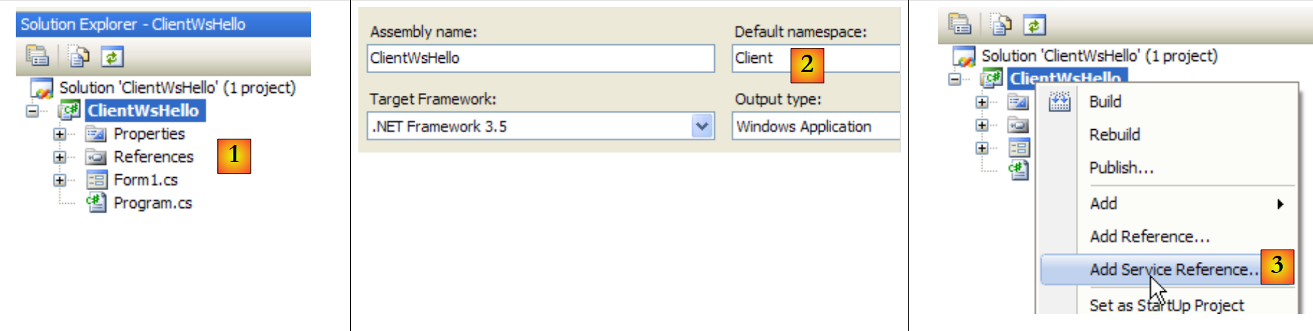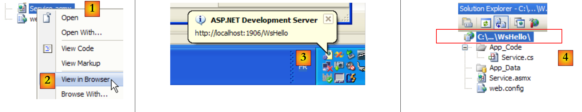 - [3]: Visual Web Developer launches its built-in web server and places its icon in the bottom-right corner of the taskbar. The web server is launched on a random port, in this case 1906. The displayed URI /WsHello is the name of the website [4].