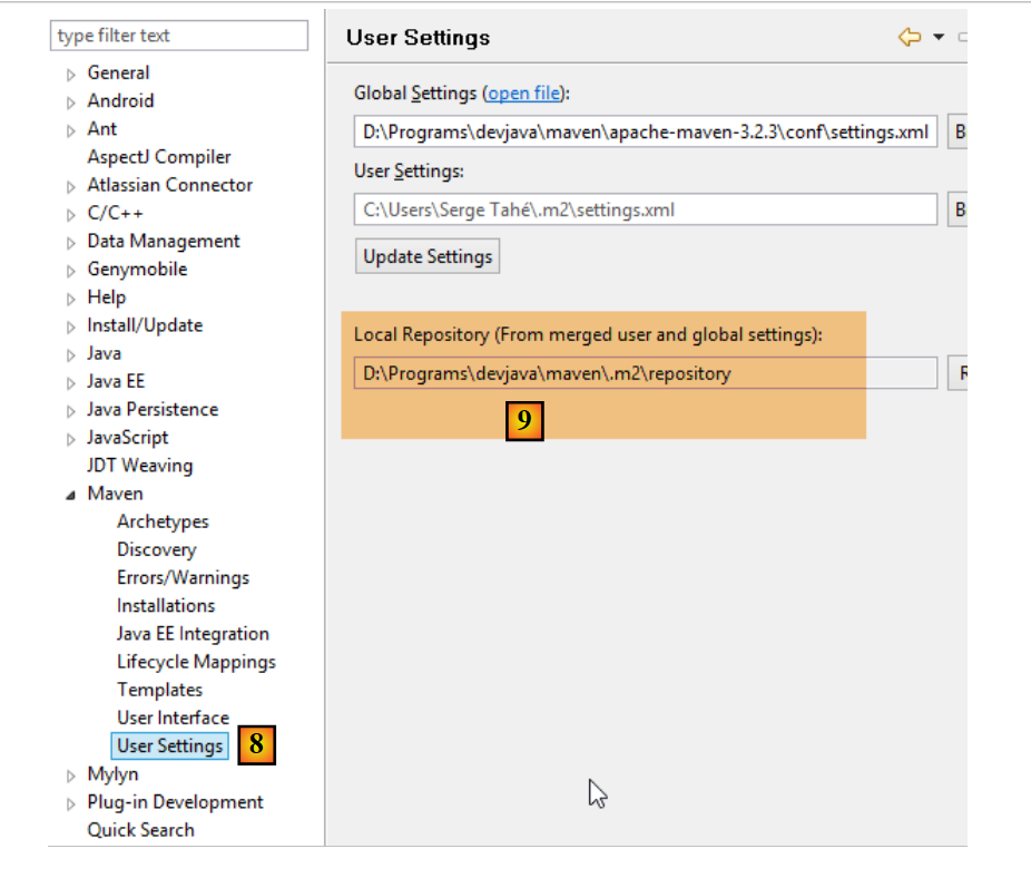 The default value on line 4 may cause issues for some software using Maven if, like me, your {user.home} path contains a space (for example, [C:\Users\Serge Tahé]). We will specify (line 7) a different folder for the local Maven repository:
