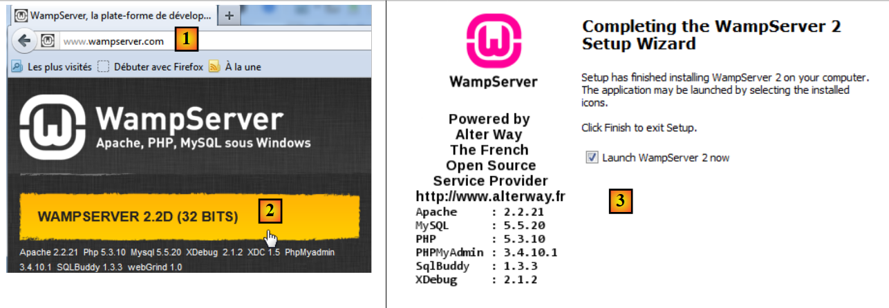 - the downloaded executable is an installer. Various pieces of information are requested during installation. They do not concern MySQL, so they can be ignored. Window [3] appears at the end of the installation. Launch [WampServer],