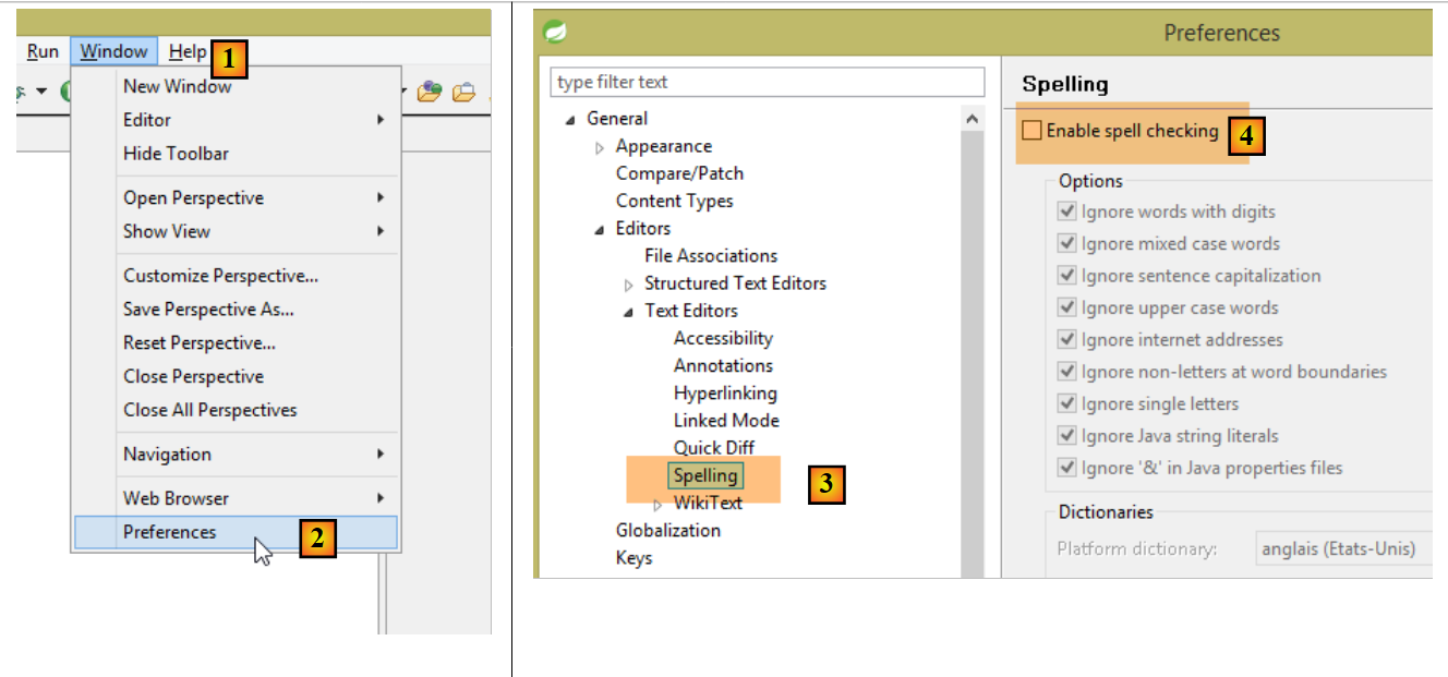 Additionally, it may be useful to disable spell checking in the project to prevent French comments from being underlined as incorrect. Follow steps [1-4] below:
