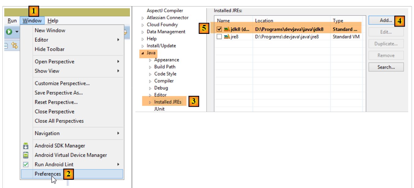 With [4], you can add JDKs (Java Development Kits) or JREs (Java Runtime Environments). The JRE can run .class files but cannot compile .java files to produce them. The JDK can do both. You should choose a JDK because certain Maven operations require one.