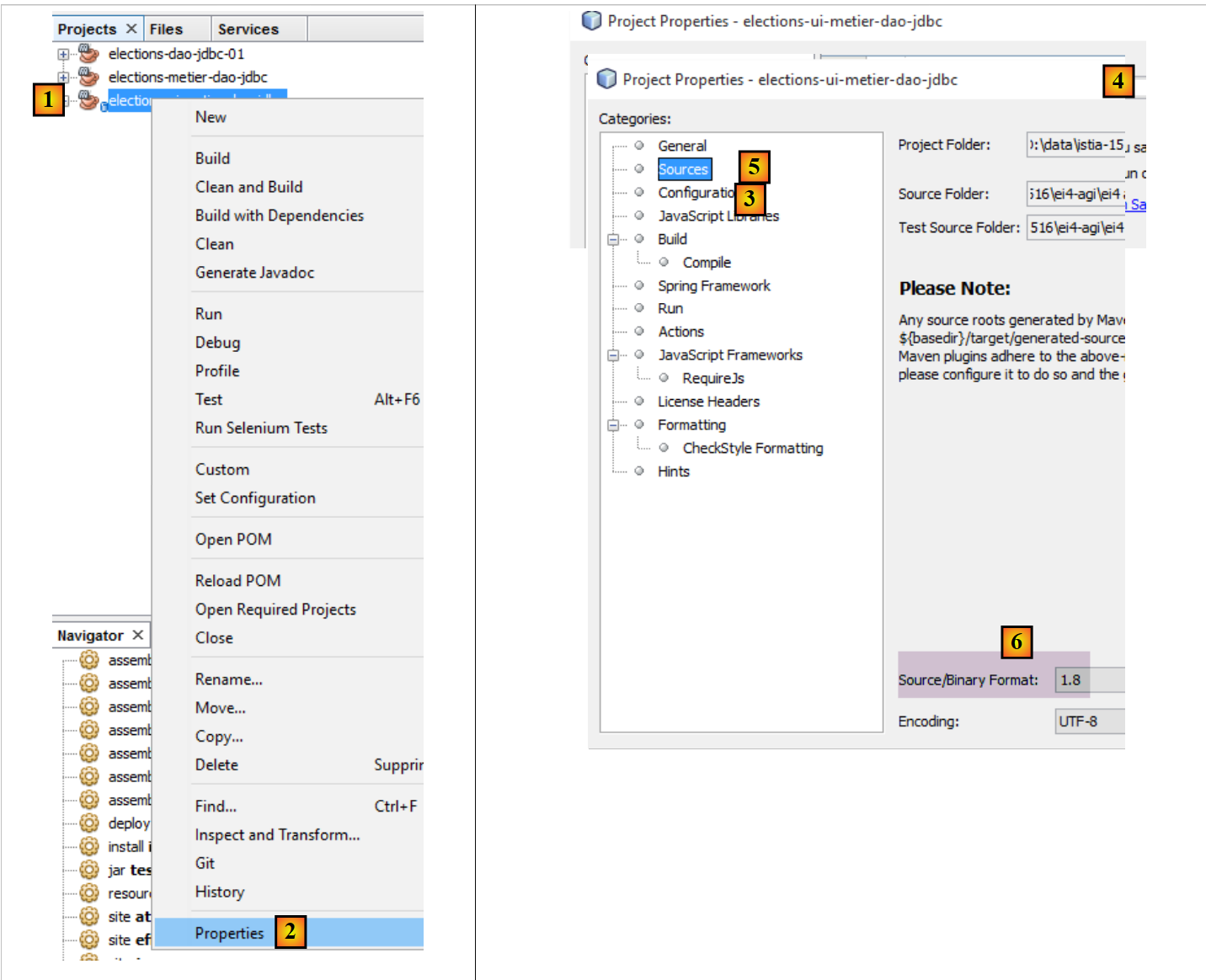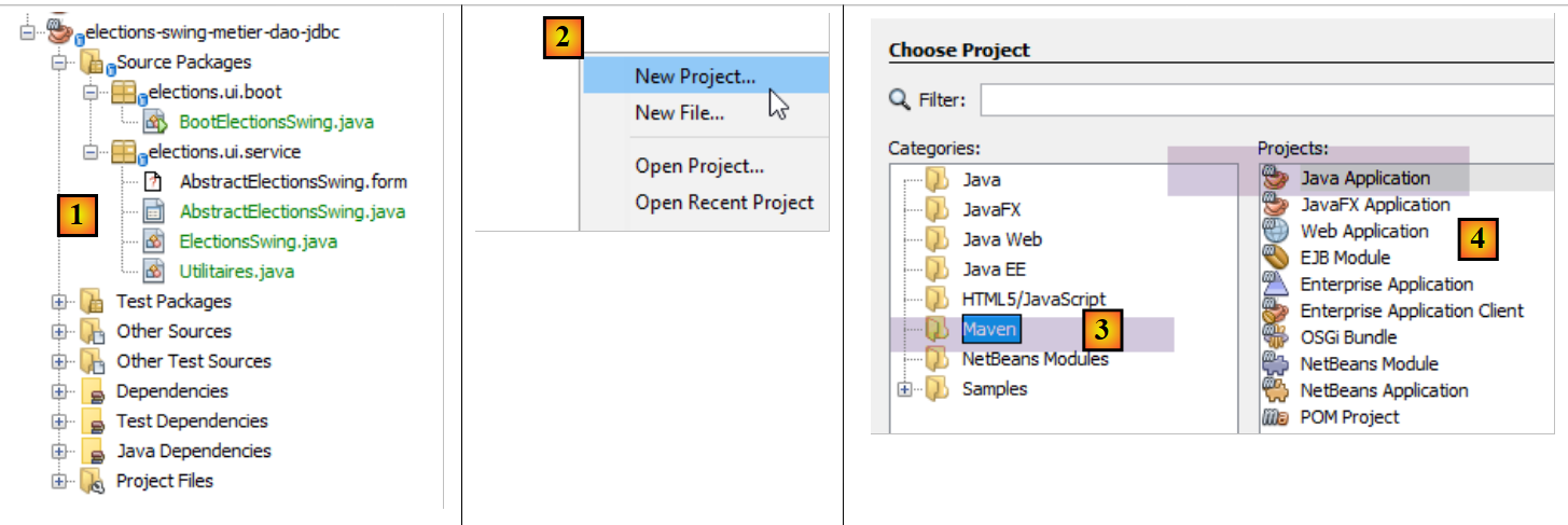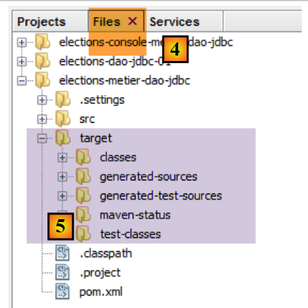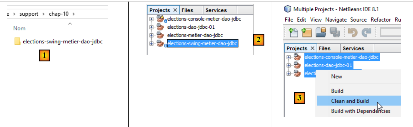 NetBeans can open any Maven project. We will therefore use the previous Maven project and add a Swing interface to it. In [2], we load (File / Open Project) the Maven projects for the three layers we built with Eclipse. Then, we build their binaries [3]. The [Build] and [Clean and Build] options build the binary for the project to which they are applied. These binaries are placed in the project’s [target] folder [4-5]: