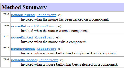 The MouseListener interface is implemented by various classes, including the MouseAdapter class. This class implements the five methods of the MouseListener interface, but these methods do nothing. Therefore, you must subclass this class to implement the method(s) of your choice. This is done in the code above and shown below: