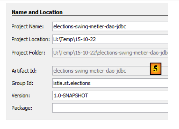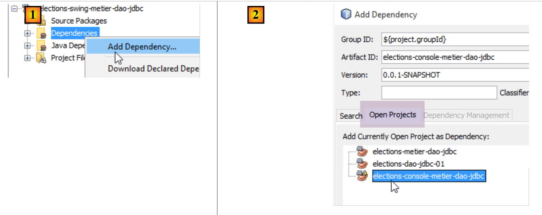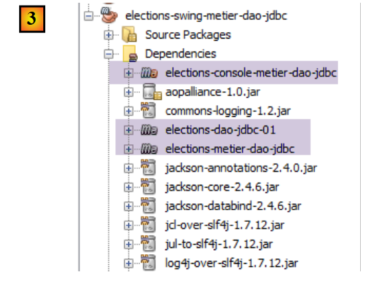 The new project [elections-swing-business-dao-jdbc] will build upon the previous project [elections-console-business-dao-jdbc]. To do this, add a Maven dependency as follows [1-3]: