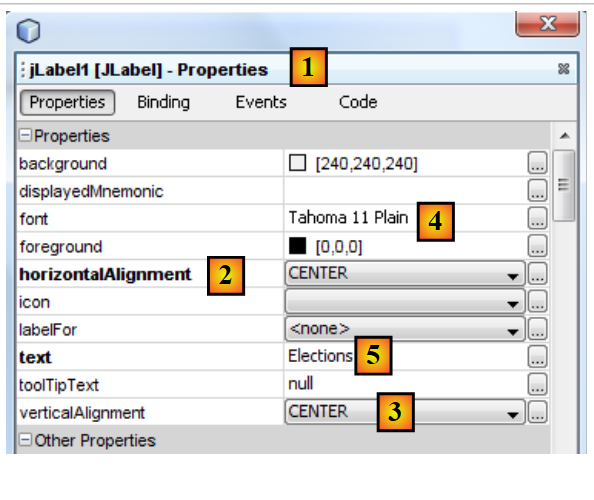 - [1]: The [Properties] tab of the [JLabel] component provides access to its properties: its horizontal position [2], vertical position [3], text font [4], and text [5].