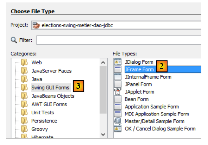 - [2]: Select the [JFrame Form] option in the [Swing GUI Forms] category