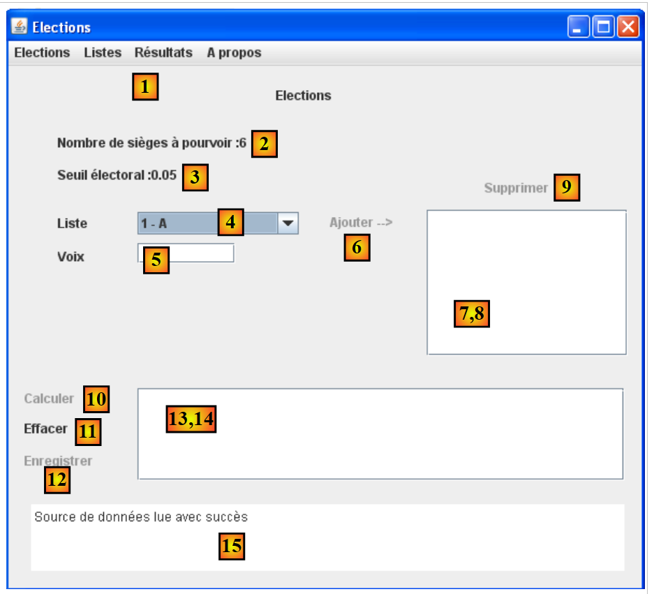The [Calculate] link [10] allows you to start the seat calculation and display the results in (14). If the calculation fails (all lists have been eliminated), an error message is displayed in [15]. In any case, after the calculation, the [Calculate] link [10] is disabled.