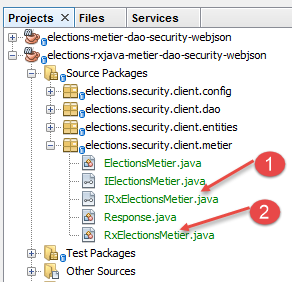 To implement the [RxJava, business] layer, we add an asynchronous interface [IRxElectionsMetier] [1] and its implementation [RxElectionsMetier] [2] to the project: