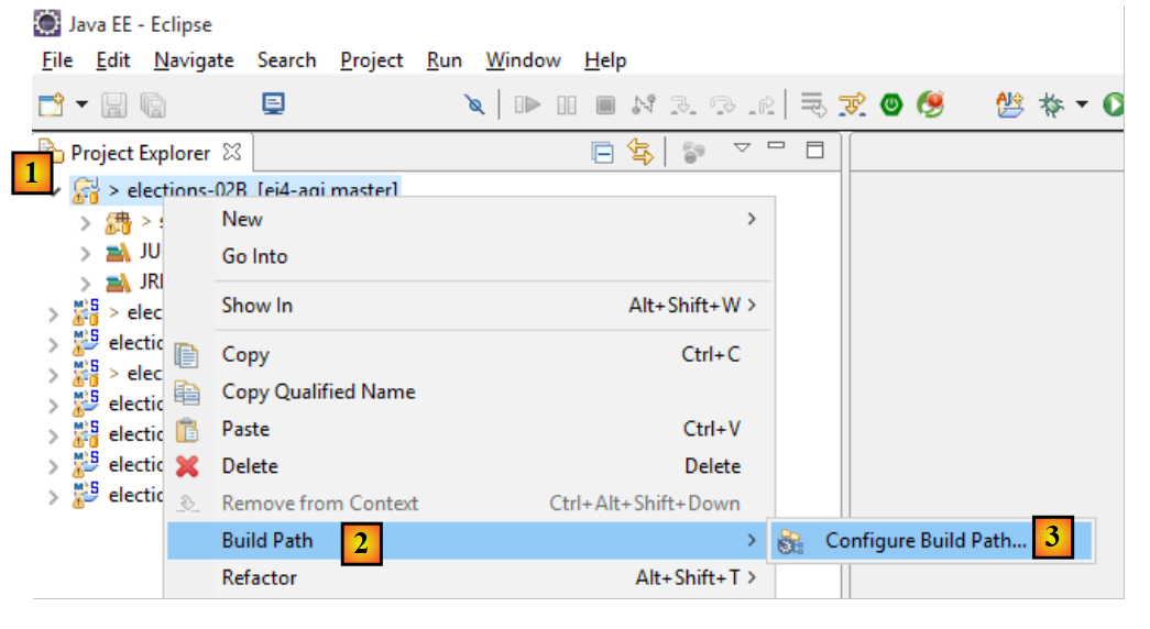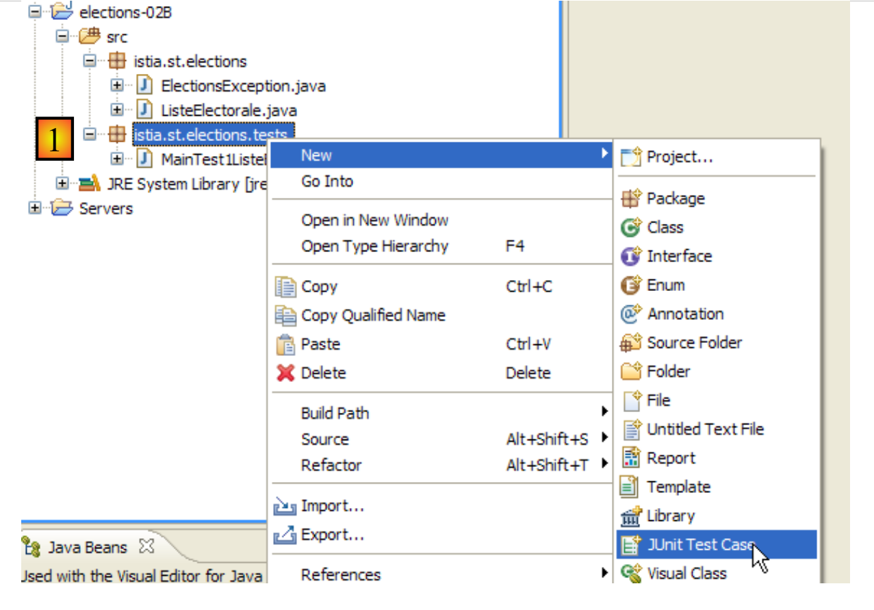 - [1]: right-click on the package where you want to add the test class, then select [JUnit / New / JUnit Test Case]