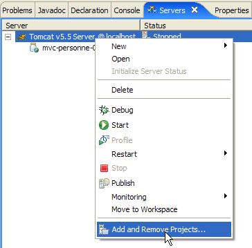 For now, it is identical to the [mvc-personne-01] project. We will need to make a few manual changes before we can use it. Go to the [Servers] view and try to add this new application to those managed by Tomcat: