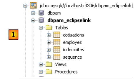 We can proceed as follows. First, in the [Runtime / Databases] tab, we will create [1] a connection to the MySQL5 / dbpam_eclipselink database: