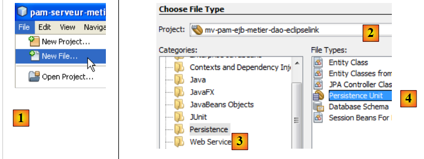 - line 3: the name of the persistence unit [mv-pam-ejb-metier-dao-eclipselinkPU] and the transaction type (JTA for an EJB container)