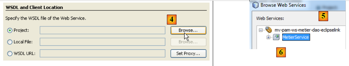 - in the [5] window, all projects with a [Web Services] branch are listed; here, only the [mv-pam-ws-metier-dao-eclipselink] project.
