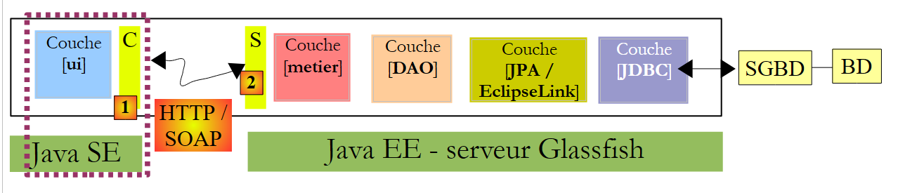 The web service is provided by a web application running within the GlassFish server’s web container. This web service will rely on the [Metier] EJB, which is deployed in the EJB3 container.