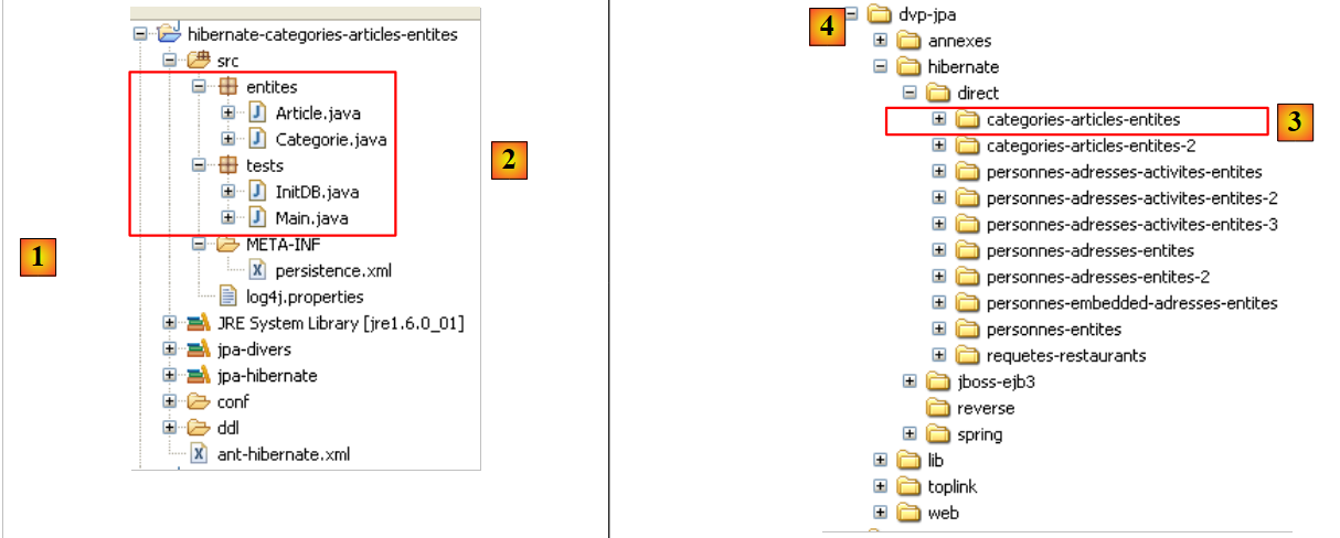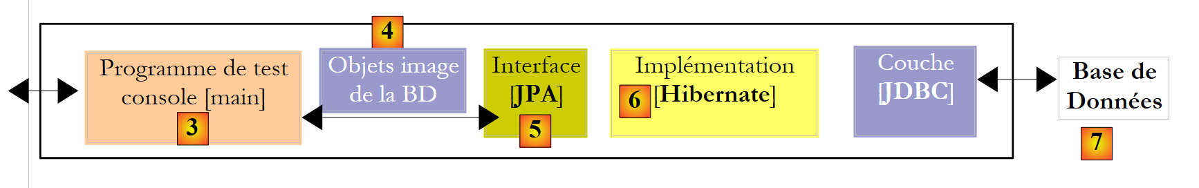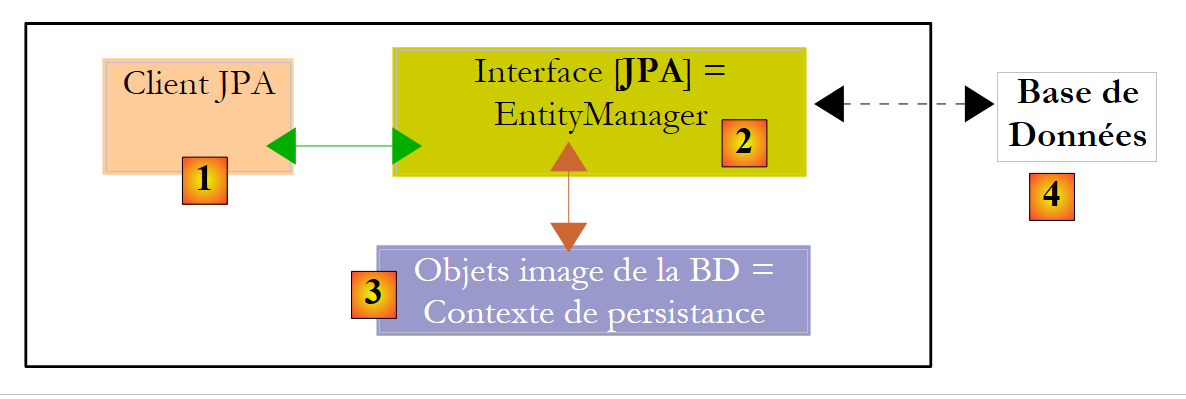 The JPA layer [5] must bridge the relational world of the database [7] and the object world [4] manipulated by Java programs [3]. This bridge is established through configuration, and there are two ways to do this: