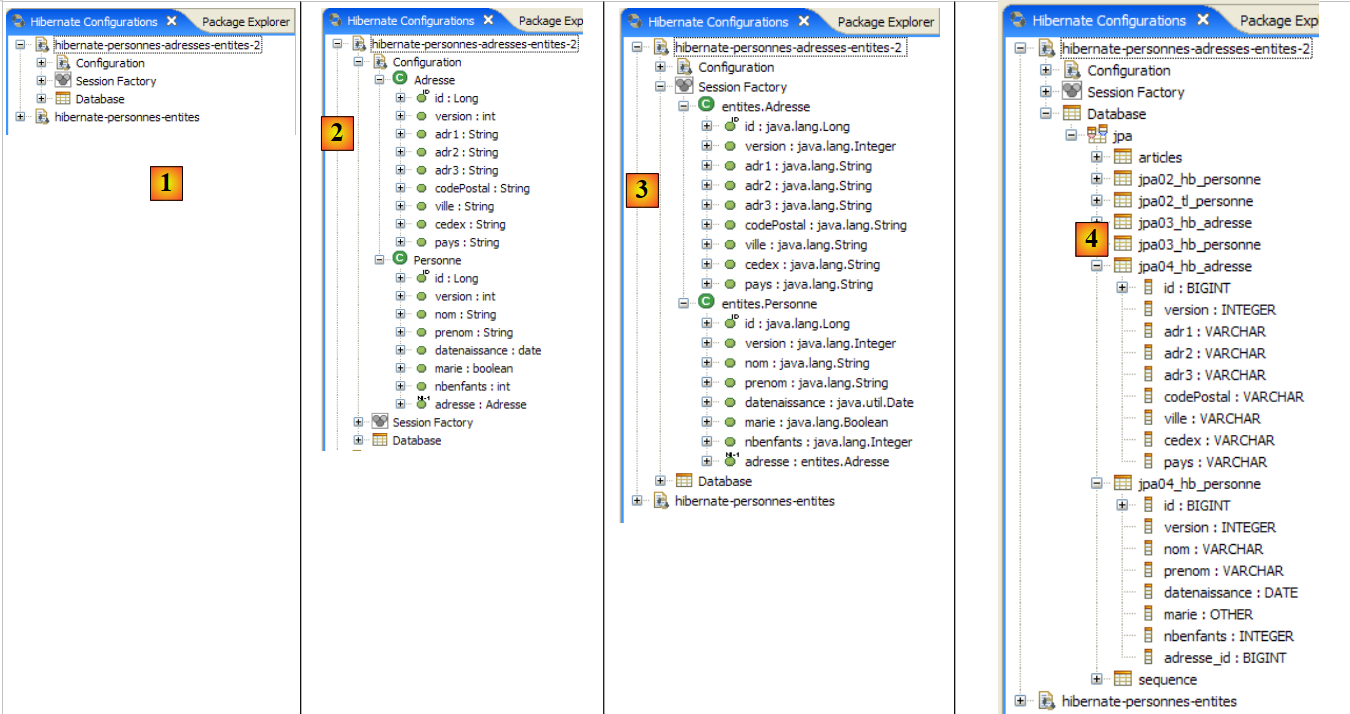Configuration is performed using Java annotations (@Annotation). Java annotations are either processed by the compiler or by specialized tools at runtime. Apart from the annotation on line 3 intended for the compiler, all annotations here are intended for the JPA implementation being used, Hibernate or Toplink. They will therefore be processed at runtime. In the absence of tools capable of interpreting them, these annotations are ignored. Thus, the [Person] class above could be used in a non-JPA context.
