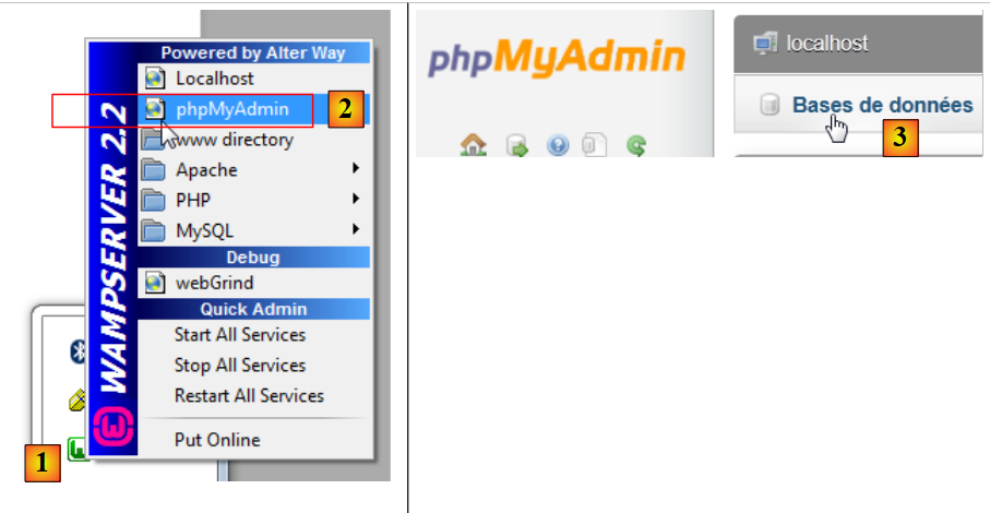 - In [1], click on the [WampServer] icon and select the [PhpMyAdmin] option [2],