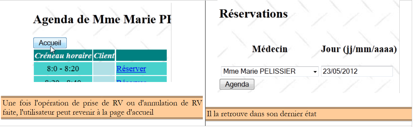 From this initial page, the user (Receptionist, Doctor) will perform a number of actions. We present them below. The left view shows the page from which the user makes a request; the right view shows the response sent by the server.