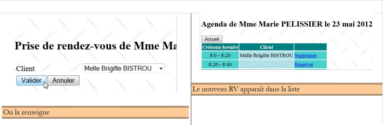The row with ID equal to 3 (see [1] above) means that an appointment was booked for slot #20 and client #4 on 08/23/2006. The [SLOTS] table tells us that slot no. 20 corresponds to the time slot 4:20 PM – 4:40 PM and belongs to doctor no. 1 (Ms. Marie PELISSIER). The [CLIENTS] table tells us that client no. 4 is Ms. Brigitte BISTROU.