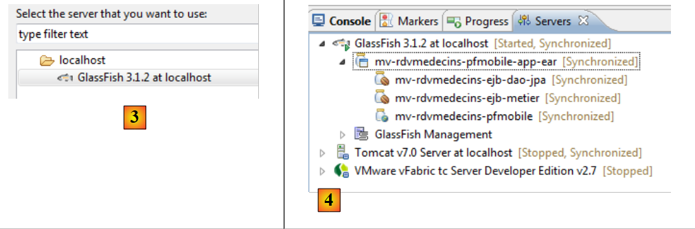 - in [4], in the [Servers] tab, the application has been deployed. It does not run on its own. You must enter its URL [http://localhost:8080/mv-rdvmedecins-pfmobile/] in a browser or mobile simulator [5]:
