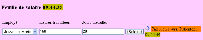 Line 8 causes the thread executing the [ButtonSalaire_Click] procedure to wait for 5 seconds. Once this is done, let’s run the tests again (after setting the EnablePartialRendering property of the ScriptManager1 component to True). This time, we see the text from [UpdateProgress] as well as the animated image while the salary is being calculated: