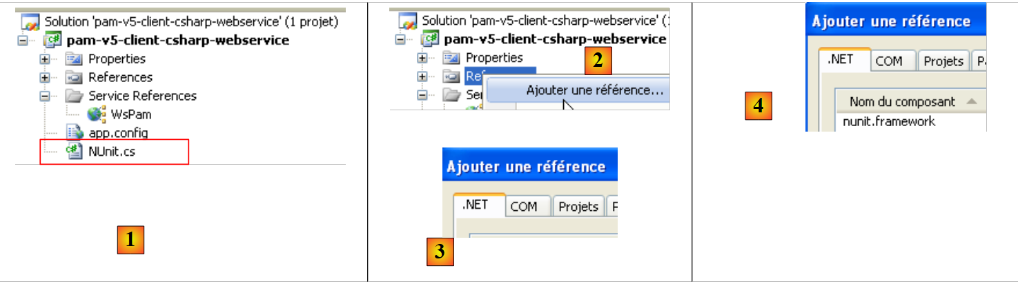 - in the [3] .NET tab, which lists the DLLs registered on the machine, we select [4], the [nunit.framework] DLL, version 2.4.6 or later.