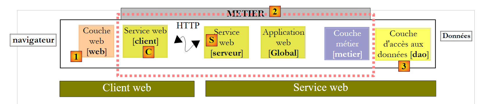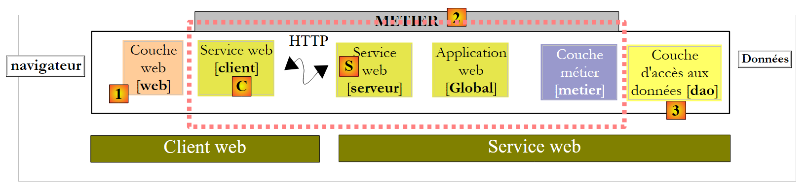 - On the server side, the web service [S] receives commands from its remote clients. It formats them to call the methods of the IPamMetier interface in the [business] layer. Once it has received the response from the [business] layer, it formats it to transmit it over the network to the client [C]. The [business] and [DAO] layers do not need to be modified.