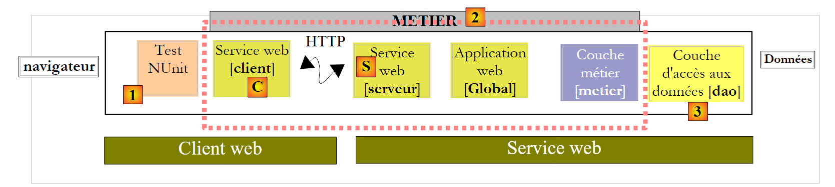 Above, we see that the test client [1] interfaces with an extended [business] layer [2]. This layer has the same methods as the remote [business] layer. We can therefore use the test class already encountered when testing the [business] layer in the C# project [pam-metier-dao-nhibernate]: