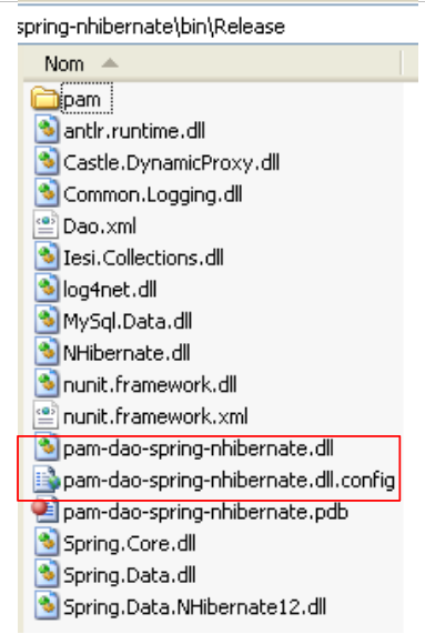 - In [1], the entire project is configured by the [App.config] and [Dao.xml] files. The [App.config] file is identical to what it was in the [dao] layer project [pam-dao-spring-nhibernate]. The same applies to the [Dao.xml] file, except that it declares an additional Spring object with the ID pammetier. The declaration of this object is identical to what it was in the [App.config] file of the [pam-metier-dao-nhibernate] project.